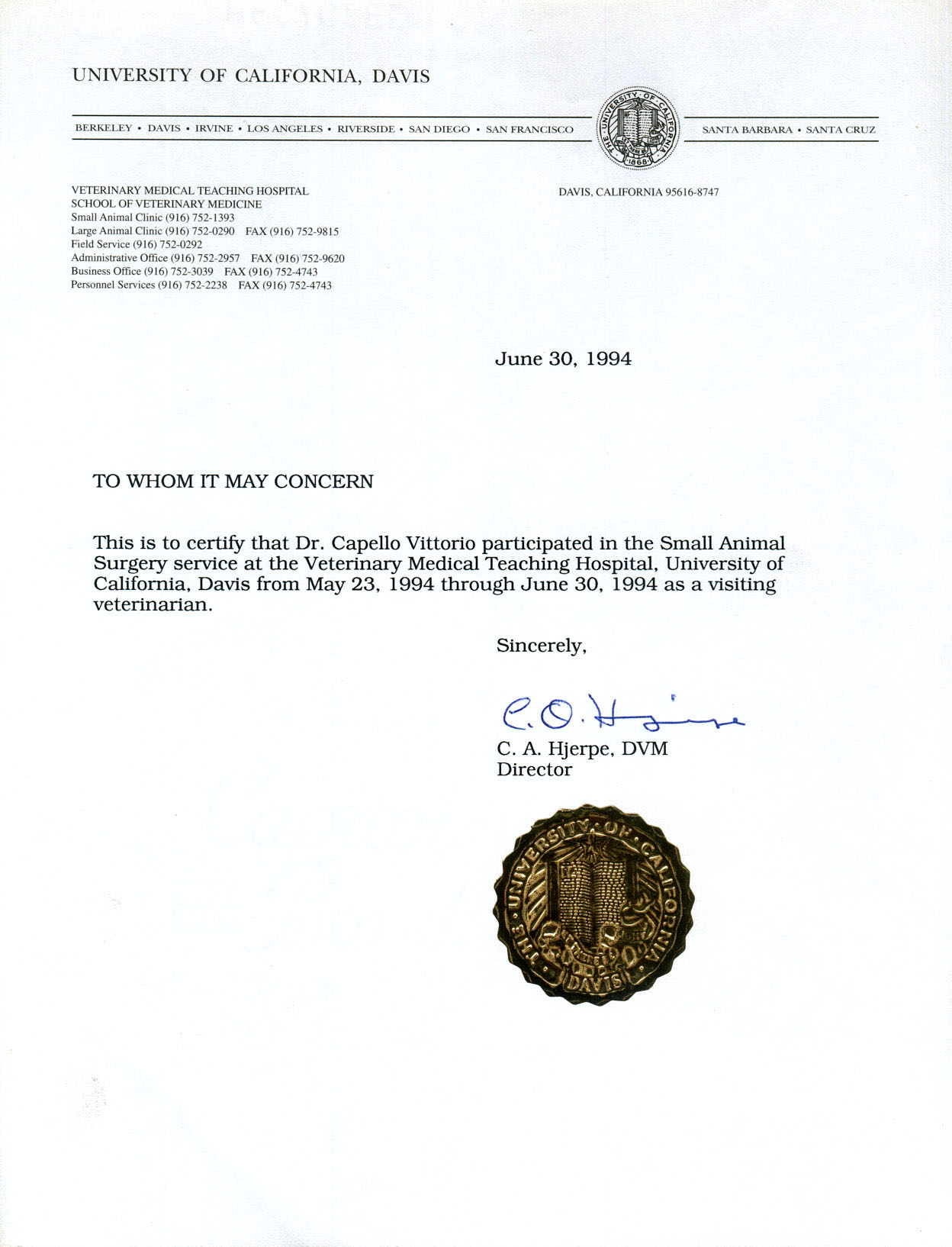 Veterinary Medical Teaching Hospital di Davis (University of California) in qualità di short term visitor.