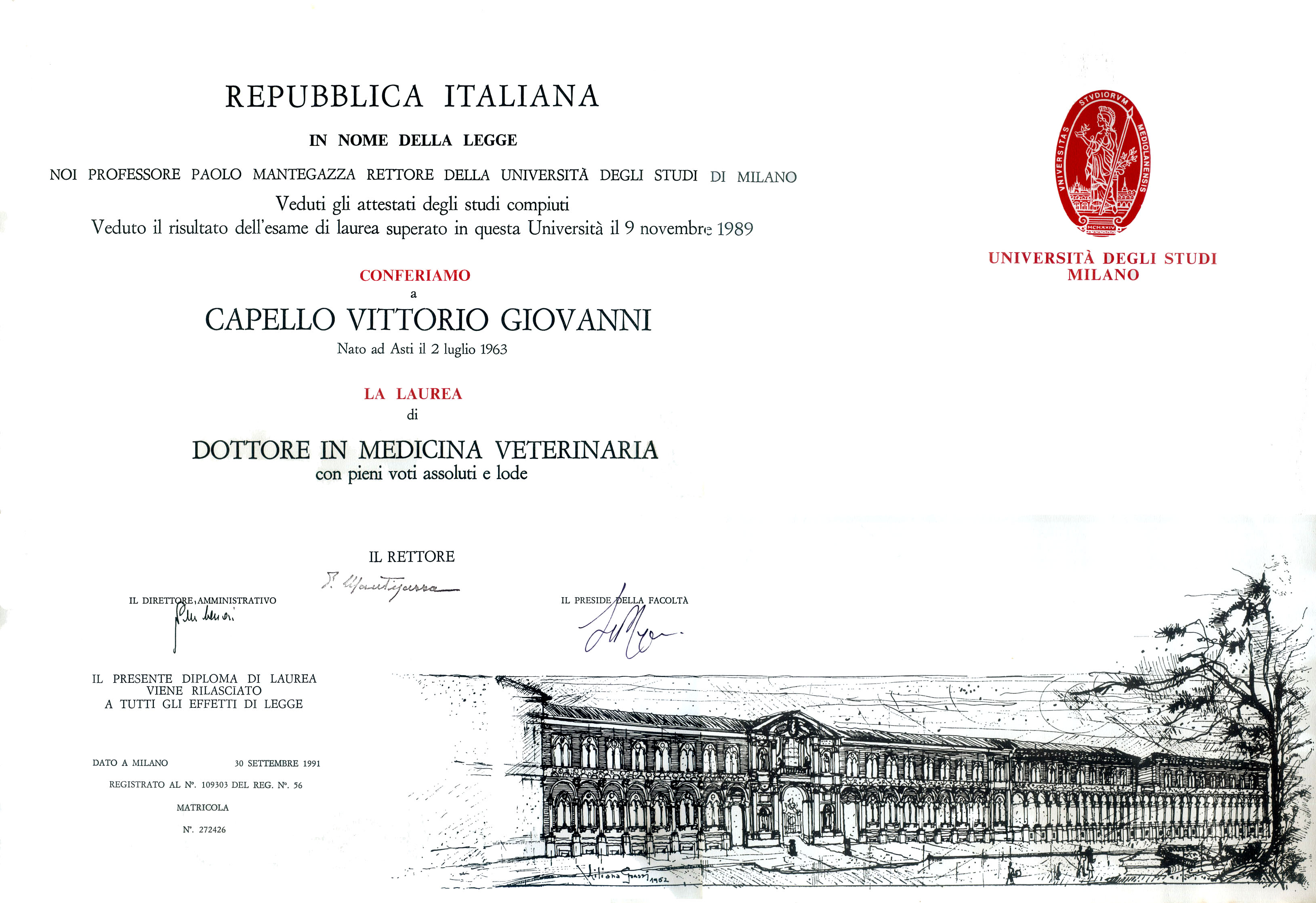 Ha conseguito la laurea con voti 110/110 e lode nella seconda sessione dell'Anno Accademico 1988/89 discutendo la tesi dal titolo: Miopatia del complesso muscolo gracile-semitendinoso nel cane che ha corredato, per la discussione in sede di laurea, di un videotape realizzato in collaborazione con il Centro Televisivo Universitario dell'Università degli Studi di Milano (C.T.U.).